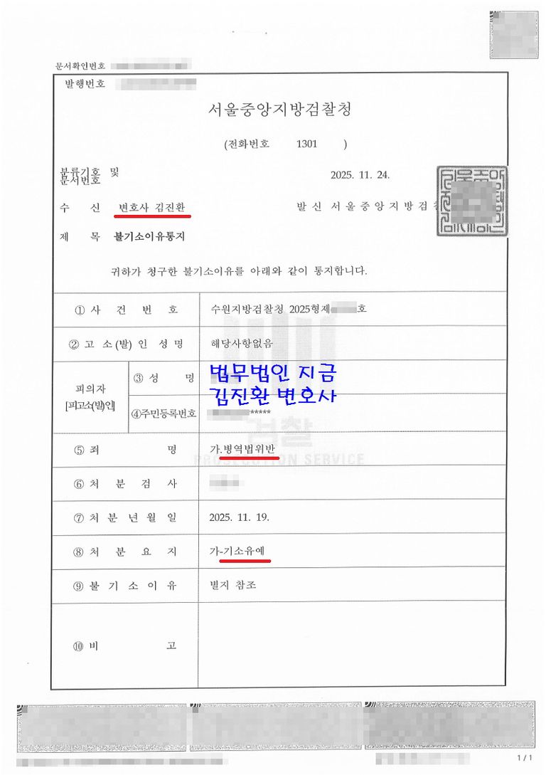 그러한 요청이 받아들여져 병무청에서 검찰로 송치된지 얼마되지 않아 바로 기소유예 불기소처분을 받게 되었는데요