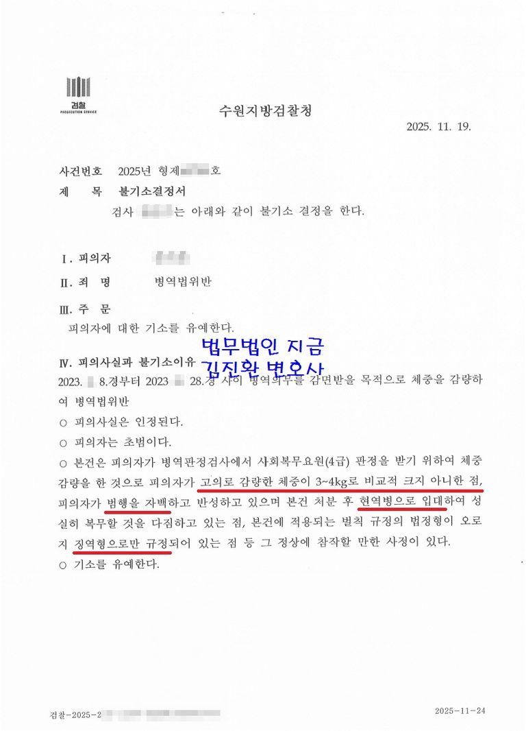 그리하여 첫 조사 때부터 혐의를 인정하고 반성하는 태도를 보였으며 최대한 빨리 현역병으로 입영할 의지를 명확하게 표시하였였고 저는 변호인의견서를 통해 피의자가 중한 범죄를 저질렀으나 감량한 체중이 크지 않고 신체상·심리적인 이유로 잘못된 판단을 하게 된 점을 피력하며 기소유예 처분을 내려주실 것을 요청드렸습니다.