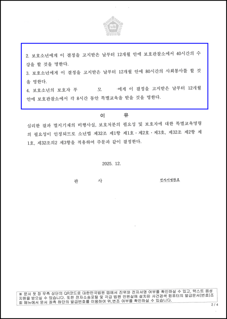 소년 재판부는 효성 변호인들의 주장을 받아들여, 의뢰인에게 경미한 보호처분(1호·2호·3호)을 결정하였습니다.