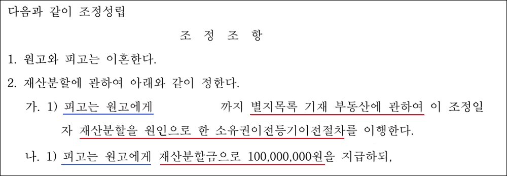 심지영 변호사의 조력으로 조정이 성립됐고, 의뢰인은 기여도가 인정되어 배우자 명의로 되어 있던 아파트 1채와 현금 1억 원을 재산분할로 받는 내용의 조정이 성립되었습니다.