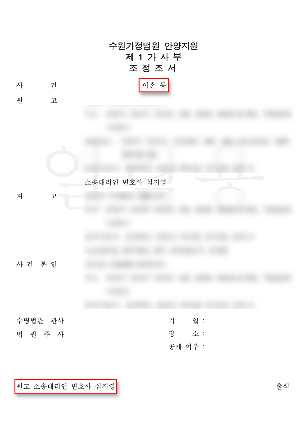 이혼 전문 심지영 변호사는 법조 경력 15년차 베테랑 변호사로, 다년간 축적된 가사 사건 경험을 바탕으로 이혼 조정과 소송 전반에서 의뢰인의 입장이 구체적인 주장과 전략으로 정리되어 반영될 수 있도록 조력하고 있습니다.