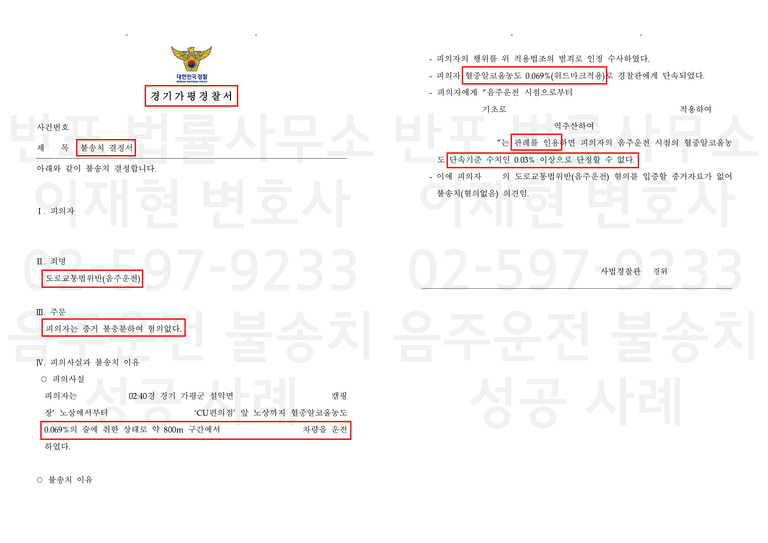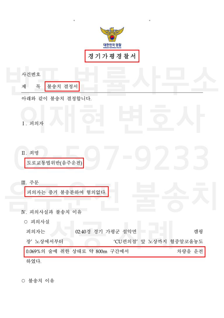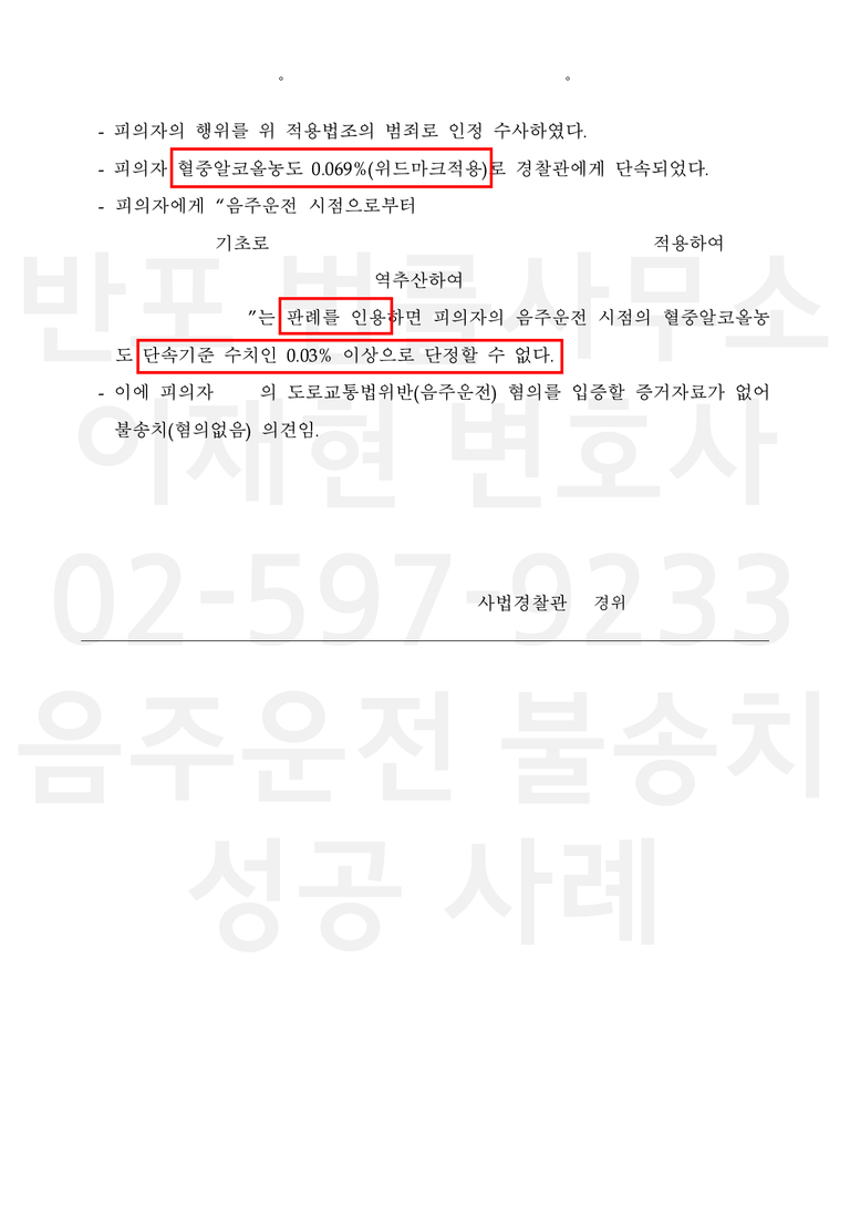 경찰은 위 수치를 바탕으로 위드마크 공식을 적용하여 운전 당시 혈중알코올농도를 0.069%로 역산하였고, 약 800m 구간 운전 사실을 근거로 도로교통법위반(음주운전) 혐의를 적용하여 사건을 입건하였습니다.