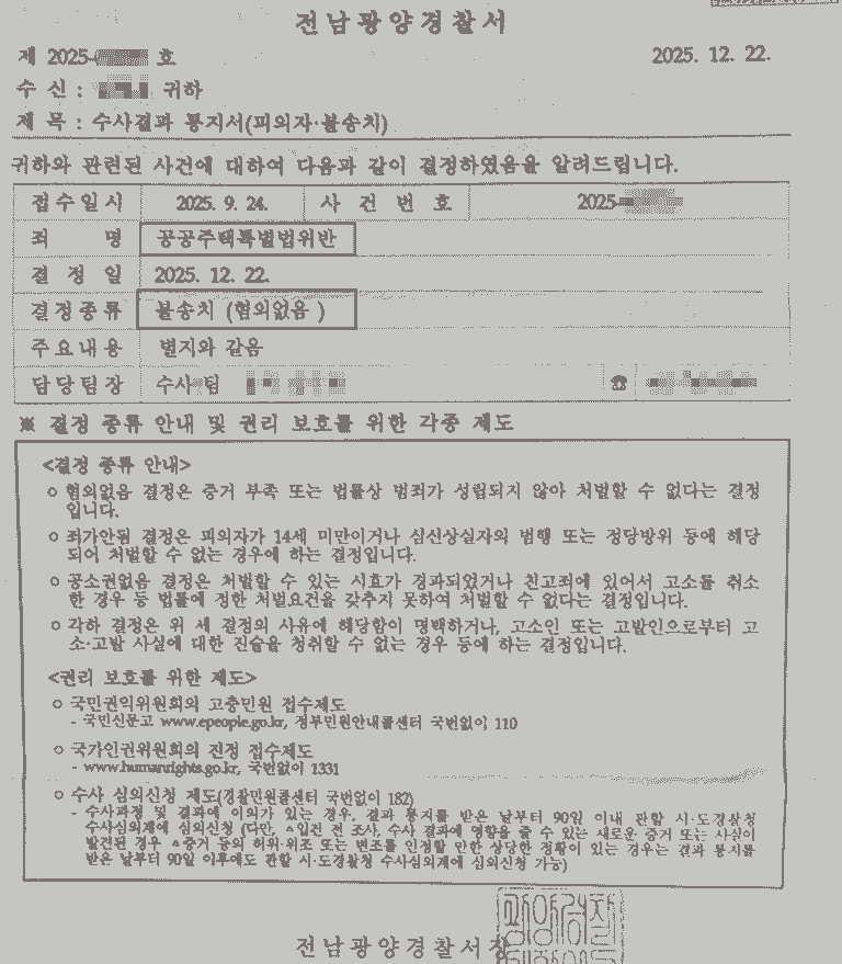당해 사건은 해당 법률이 적용되는 사건이 아니라는 취지, 공모 관계 부인 취지의 의견서 제출과 변호인 입회 등을 통하여 입건 3개월 만에 불송치 결정을 받았습니다.