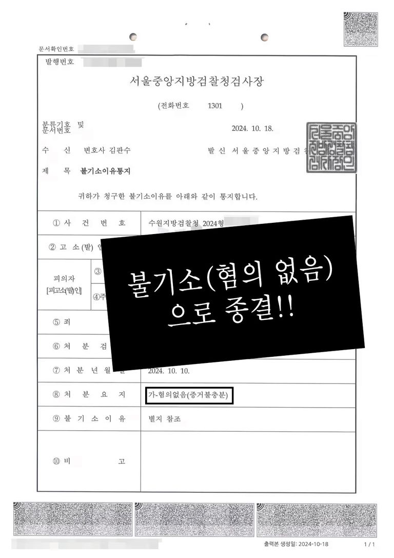 불기소 처분(무혐의)을 받아낸