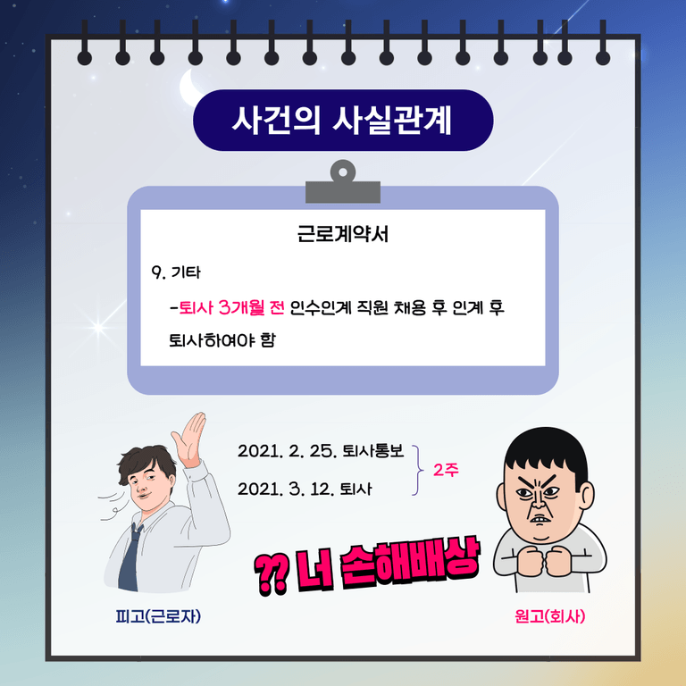그런데 피고는 2021년 2월 25일 퇴사 의사를 밝힌 후, 불과 2주 뒤인 3월 12일 퇴사하였습니다. 이에 원고 회사는 “인수인계를 마치지 않고 무단으로 퇴사했다”며 손해배상을 청구했습니다.