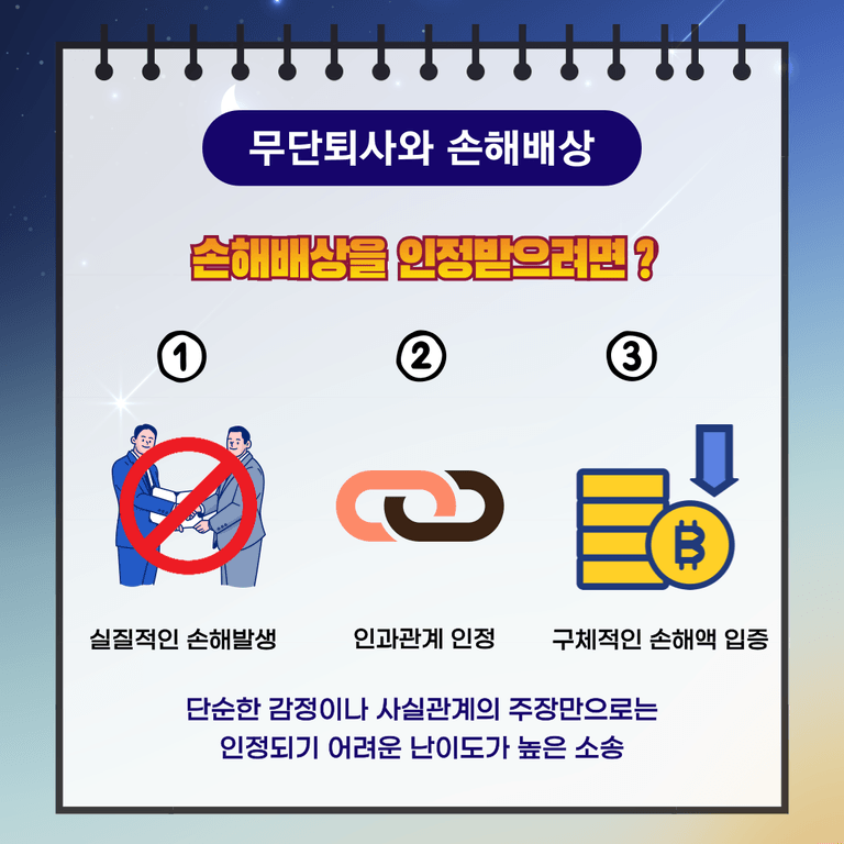 사용자 입장에서는 직원의 갑작스러운 퇴사가 억울하게 느껴지고, 손해배상을 청구하고 싶은 마음이 드는 것이 자연스럽습니다. 그러나 법적으로 손해배상이 인정되려면 다음 요건이 필요합니다.
