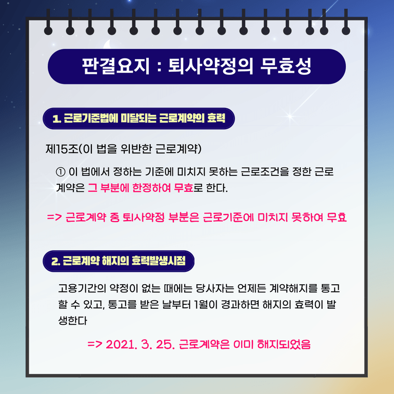 법원은 “퇴사 3개월 전 인수인계”라는 조항은 근로기준법보다 불리한 조건이므로 무효라고 판단했습니다.