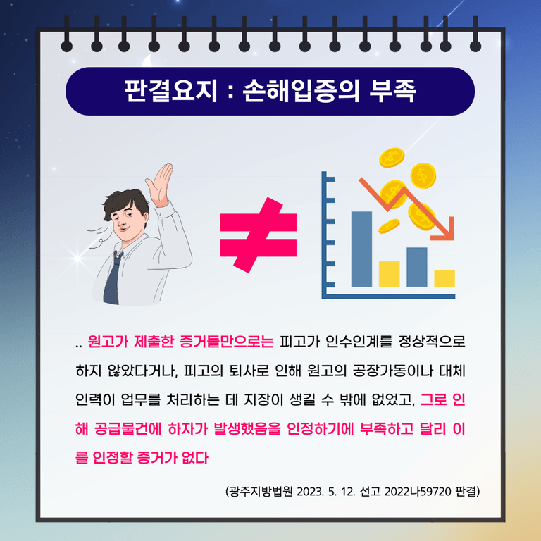 회사가 주장한 손해—공장 가동 차질, 대체인력 업무 지장, 공급 물건 하자 발생—등은 증거가 부족하다고 보았습니다.