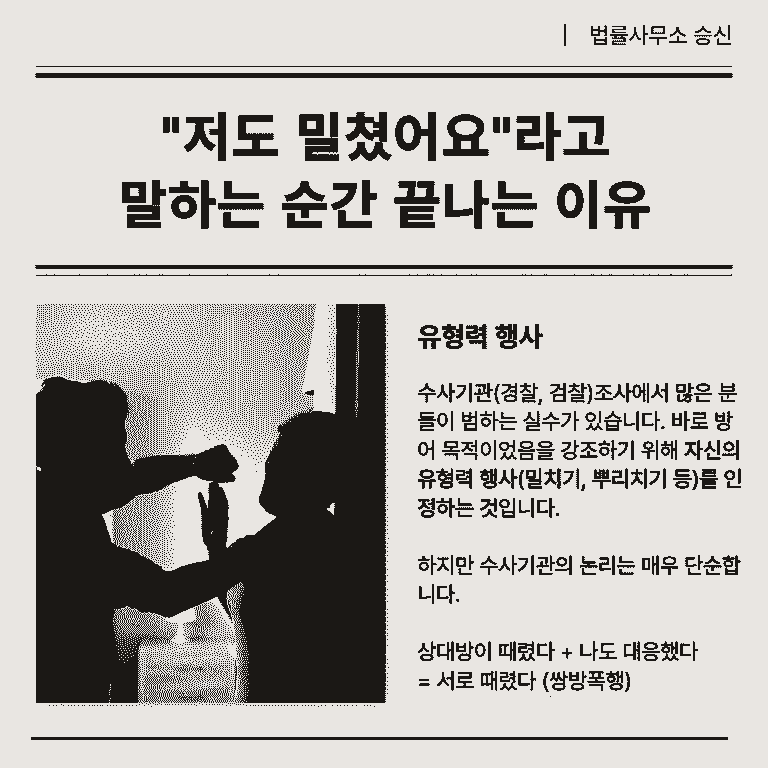 바로 방어 목적이었음을 강조하기 위해 자신의 유형력 행사(밀치기, 뿌리치기 등)를 인정하는 것입니다.