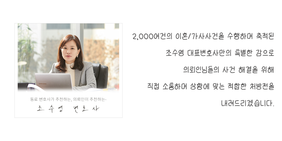 소송으로 가면 남편분이 더 많은 재산분할금을 가지고 올 수 있었으나, 남편분은 아이들을 생각해서라도 아내와 좋은 관계로 남고 싶다하여 조정을 원만히 마무리 했습니다.
