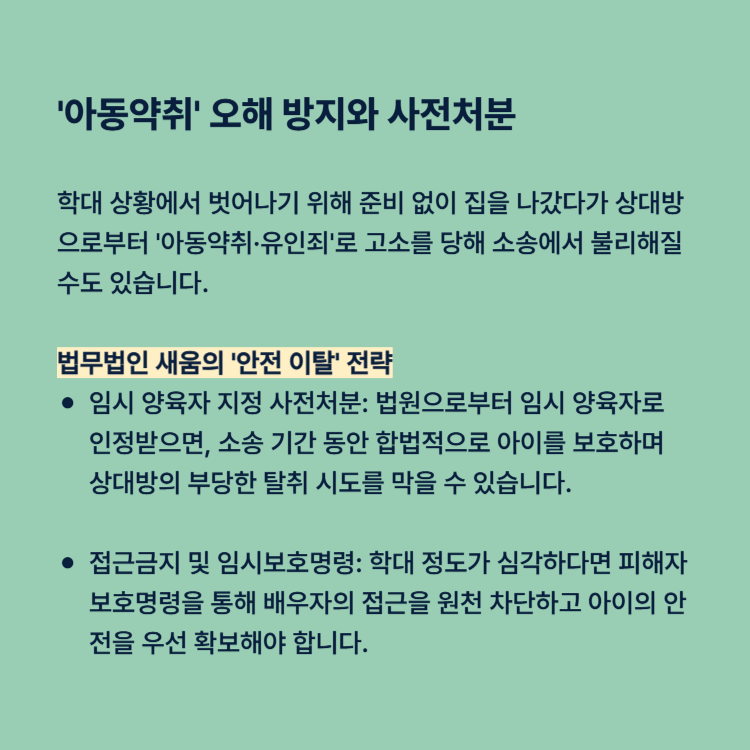 학대 상황에서 벗어나기 위해 아이를 데리고 집을 나오는 과정에서 많은 분이 실수하는 지점이 있습니다. 준비 없이 집을 나갔다가 상대방으로부터 '아동약취·유인죄'로 고소를 당하거나, "아내가 아이를 무단으로 탈취해갔다"는 비난을 받으며 소송에서 불리해질 수 있기 때문입니다.