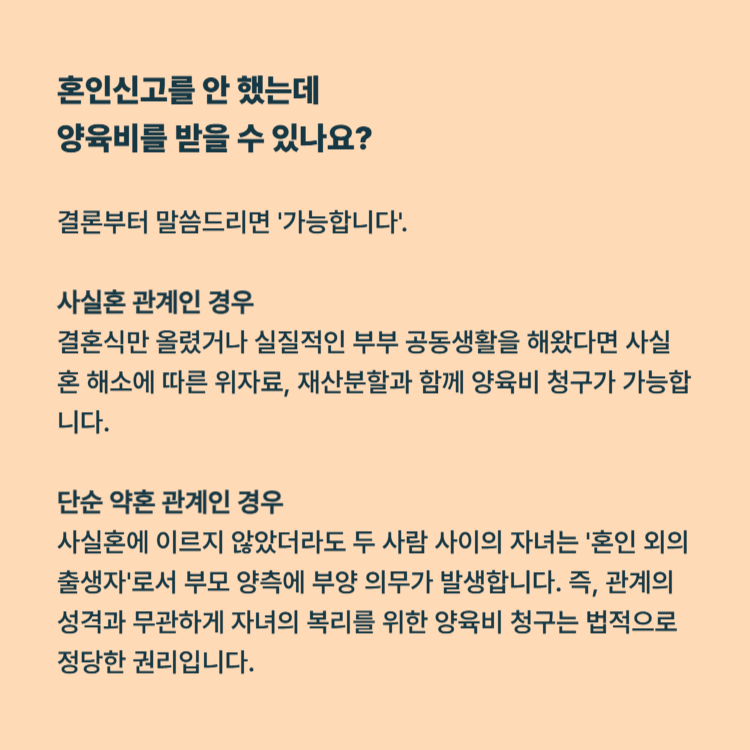 많은 분이 "혼인신고를 안 했는데 이혼처럼 양육비를 받을 수 있나요?"라고 묻습니다. 결론부터 말씀드리면 '가능합니다'.