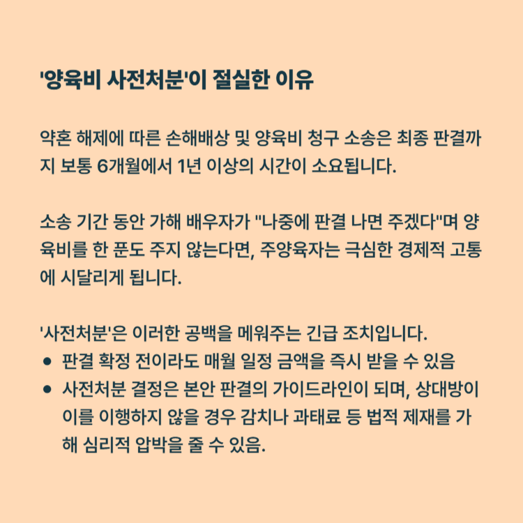 약혼 해제에 따른 손해배상 및 양육비 청구 소송은 최종 판결까지 보통 6개월에서 1년 이상의 시간이 소요됩니다. 소송 기간 동안 가해 배우자가 "나중에 판결 나면 주겠다"며 양육비를 한 푼도 주지 않는다면, 주양육자는 극심한 경제적 고통에 시달리게 됩니다.