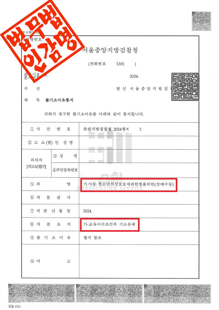 춘천지방검찰청은 이 사건에 대해 다음과 같은 사유로 ‘교육이수조건부 기소유예’ 결정을 하였습니다.