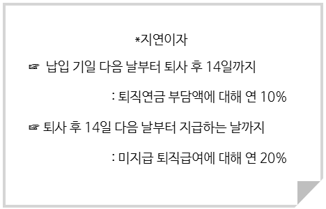 사용자는 퇴사할 때 맞춰서 주면 되는 것 아니냐고 주장할 수 있겠으나, 법에서는 지연이자를 추가로 납입하도록 규정하고 있습니다.