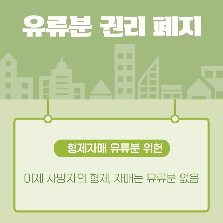 기존의 유류분 권리는 자녀, 배우자, 손자녀, 부모, 형제자매 순으로 있었는데요, 이번 위헌 결정으로 사망자의 형제자매의 유류분권이 완전히 폐지되었습니다. 이제 형제자매는 사망자가 생전에 유언으로 상속권을 배제하면 상속을 받을 수 없습니다.