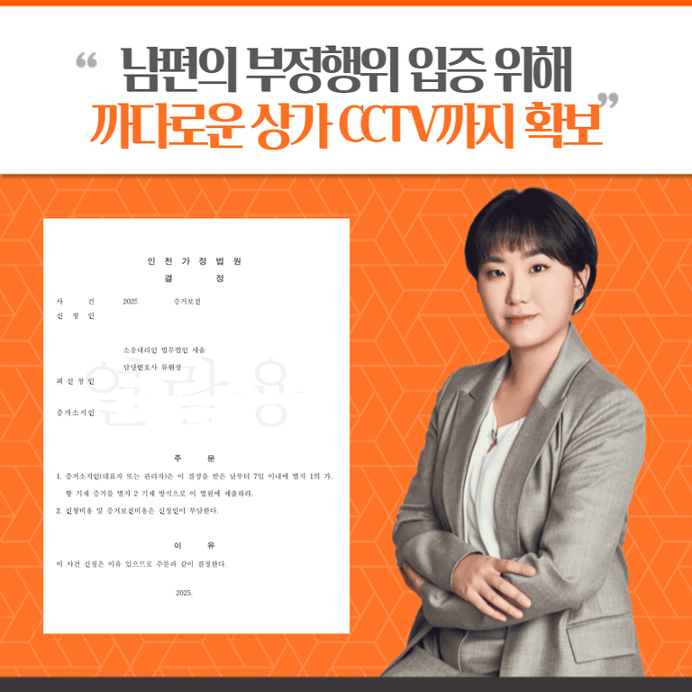 의뢰인의 남편분과 상간자는 동거하는 등 강도 높은 부정행위를 반복하였고, 이를 알게 된 의뢰인이 동거하고 있는 거주지와 상간자가 일하고 있는 상가에 남편분이 자주 방문하는 것을 알고 계셔서 해당 상가의 CCTV를 증거보전으로 받아주실 것을 요청하셨습니다.