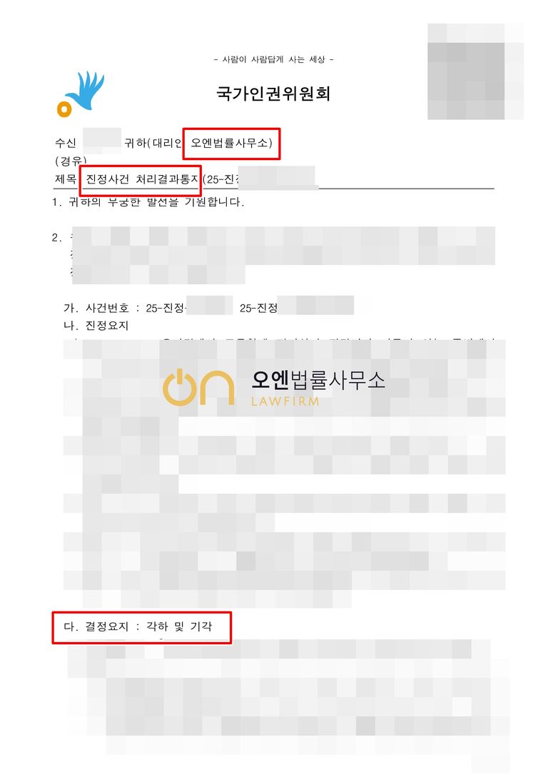 국가인권위원회는 담당변호사의 주장을 받아들여, 진정사건에 대한 각하 및 기각 결정을 내렸습니다.