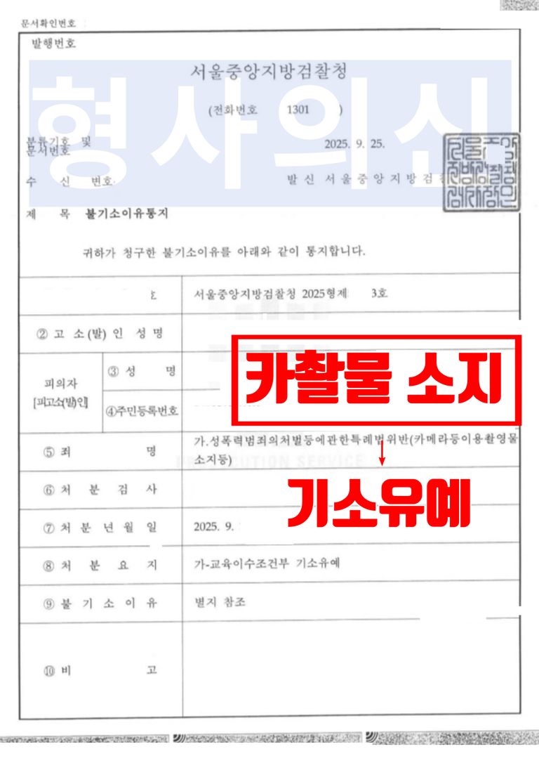 서울중앙지방검찰청 검사는 법률사무소 유(唯)의 형사전문변호사의 주장 및 제출한 양형사유를 받아들여 범행 사실은 인정되나, 의뢰인이 자신의 잘못을 모두 인정하며 깊이 반성하고 있는 점, 붋법촬영물을 유포하거나 제공하지는 않은 것으로 보이는 점 등을 이유로 보호관찰소에서 실시하는 음란물사범 재범방지 교육을 이수하는 조건으로 기소를 유예하였습니다.
