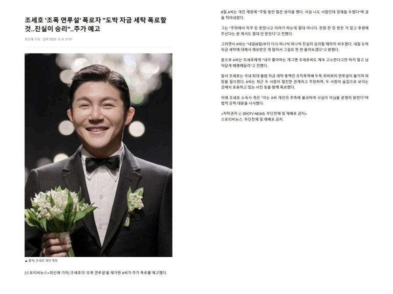 유명 연예인에 관한 과거사 등 폭로에 대하여 일반인과 같은 기준이 적용되지 않는다는 점은 있으나 단순한 명예훼손의 결과를 넘어 한 사람의 직업을 상실케 하는 결과에 이르게 한 점은 좀 심한 것 아니냐는 의견들이 더 많은 것 같습니다. 조진웅의 전과가 좀 빡세긴 하다는 것은 전에 언급한 바가 있는데 직업을 잃어야만 하는 결론에 꼭 이르러야 한다는 의미는 아니었습니다. 특히 나이트클럽을 비롯하여 지방에서 행사를 주최하는 사람들이 불법과 합법의 경계에 있는 사람들이 많은 것이 현실인 점을 고려할 때 조세호를 나락보낸 것은 좀 심한 것 아닌가 하는 생각도 듭니다. 비록 유명 연예인이라도 관심을 받기 위한 목적의 폭로는 지양되어야 할 것입니다.