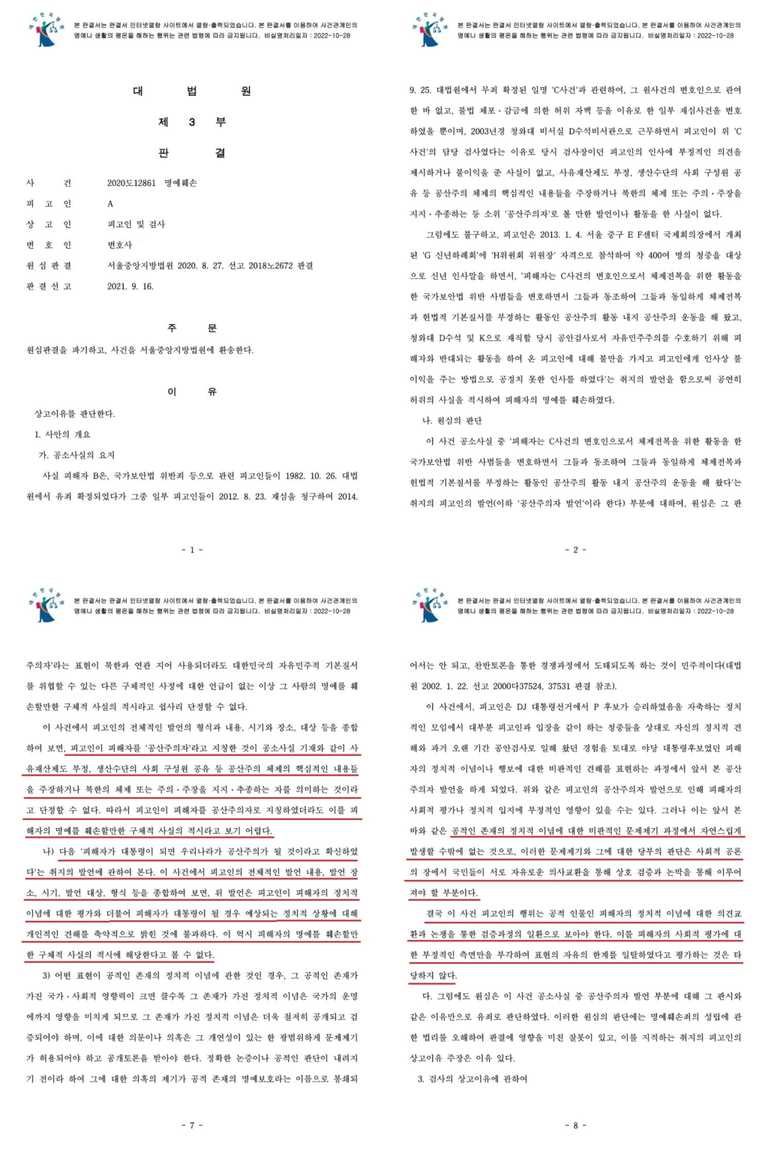 결국 이 사건 피고인의 행위는 공적 인물인 피해자의 정치적 이념에 대한 의견교환과 논쟁을 통한 검증과정의 일환으로 보아야 한다. 이를 피해자의 사회적 평가에 대한 부정적인 측면만을 부각하여 표현의 자유의 한계를 일탈하였다고 평가하는 것은 타당하지 않다.”라고 판단하였습니다.