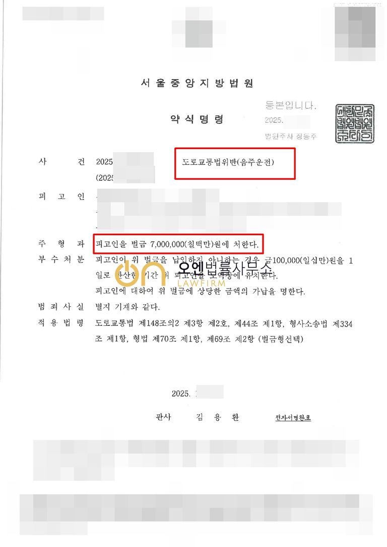 수사기관은 담당변호사의 주장을 받아들여 단순 음주운전 사건으로 처리하였고, 검찰은 구약식 처분을 내려 약식명령 벌금형이 선고되었습니다.