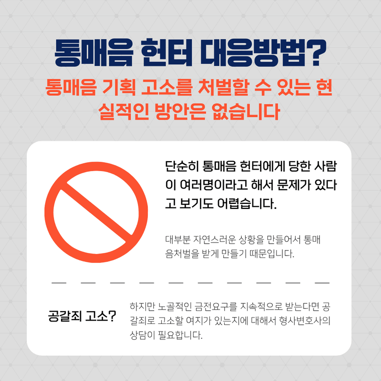 통매음 기획 고소를 처벌할 수 있는 현실적인 방안은 없습니다. 단순히 통매음 헌터에게 당한 사람이 여러명이라고