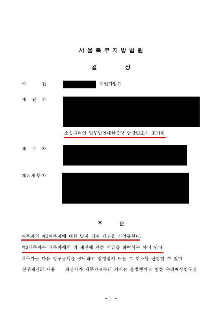재판부는 조기현 변호사의 주장을 모두 인정하고 채권가압류신청이 이유있다며 상대방의 예금 채권 중 청구금액 4억 4천만원에 이를 때까지 금액을 가압류하는 결정을 했고, 상대방은 은행에 있는 재산을 빼돌릴 수 없게 되었습니다.