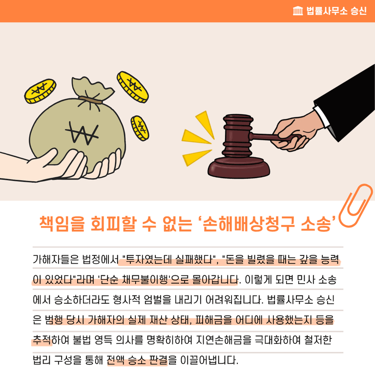 저희는 가해자의 다수 피해자 존재 여부, 재산 처분 정황 등을 논리적으로 입증합니다.