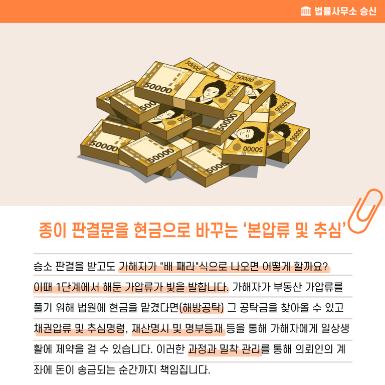 "승소 판결문은 입구일 뿐입니다. 실제 돈을 가져오는 것은 집행의 영역입니다."