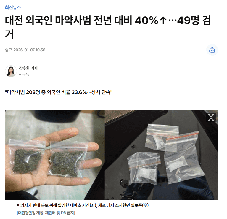 최근, 대전에서는 외국인 마약사범이 여럿 적발된 바 있는데 전년 대비 40% 가 늘어났다고 하는 기사가 있습니다.