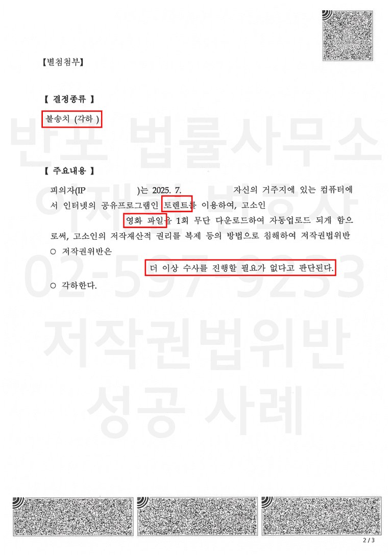 토렌트 저작권법 위반 사건은 단순히 합의금 문제로만 접근할 경우 오히려 불리한 결과로 이어질 수 있습니다. 초기 단계에서 사건의 성격과 대응 방향을 정확히 설정하지 않으면 형사절차로 진행될 가능성도 배제할 수 없습니다.
