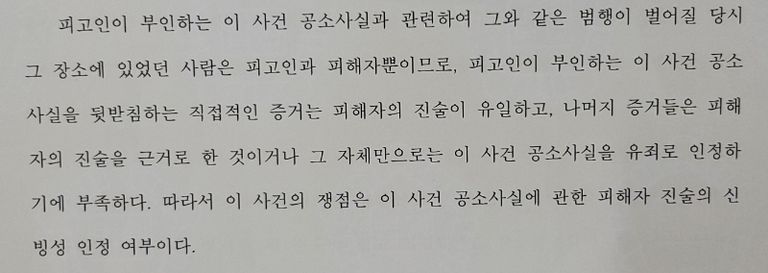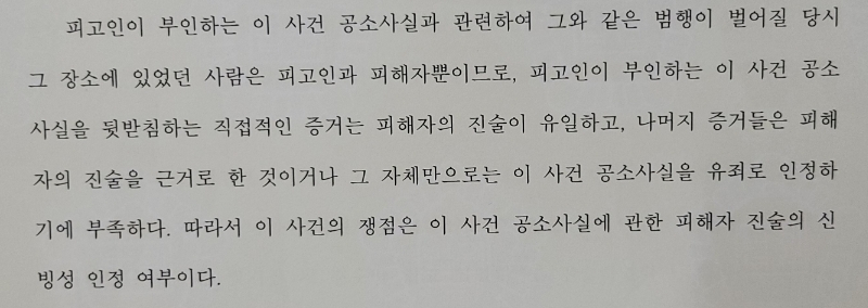 아청법위반(준강간)도 준강간과 기본적인 구조가 같습니다. 이 사건은 CCTV도 없었고 같이 무인텔에 들어간 친구도 이후 상황은 전혀 몰랐기 때문에 유일한 증거는 피해자의 진술뿐이었고 나머지 증거들은 모두 피해자의 진술을 근거로 한 것이거나 그 자체만으로 공소사실을 유죄로 인정하기 부족한 것들이었습니다. 따라서 가해자를 유죄로 인정하기 위해서는 반드시 피해자 진술의 신빙성이 인정되어야만 하는 사안이었습니다.