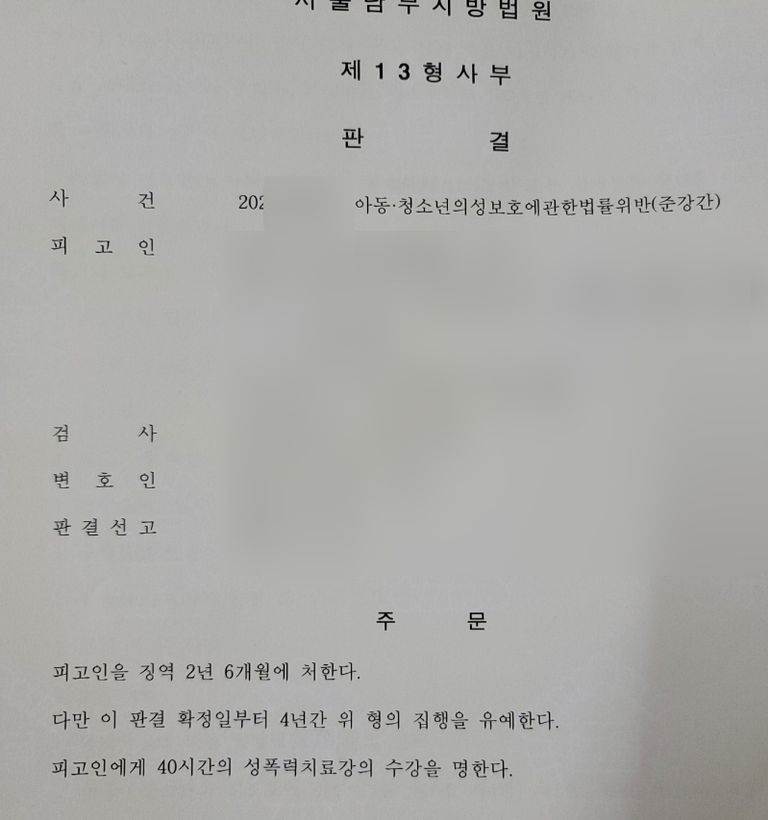 이 사안은 합의가 이루어졌기 때문에 가해자는 실형을 피하였습니다. 징역2년6월에 집행유예 4년이 선고되었고 40시간의 성폭력치료강의 수강명령이 부과되었습니다.