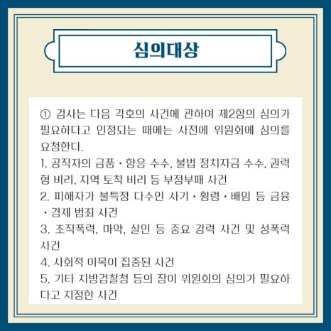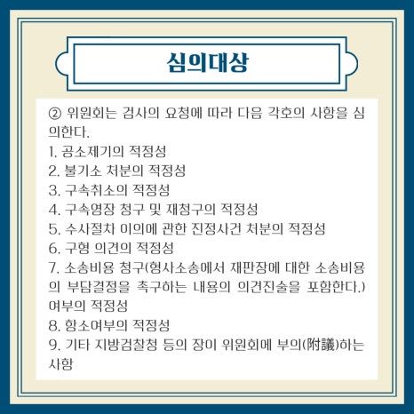 검사의 요청에 따라 공소제기, 불기소 처분, 구속영장청구, 구속취소 등의 적정성을 심의합니다.