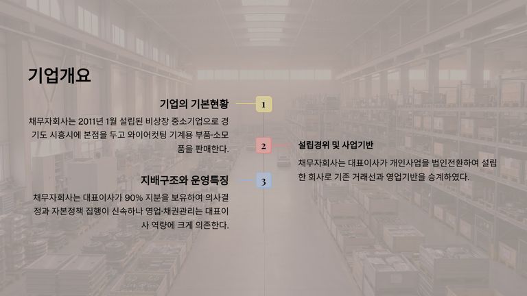 채무자회사는 2011년 1월 설립된 비상장 중소기업으로서 경기도 시흥시에 본점을 두고, '와이어컷팅 기계용 부품 및 소모품'의 판매(도·소매)를 주력사업으로 영위한다.