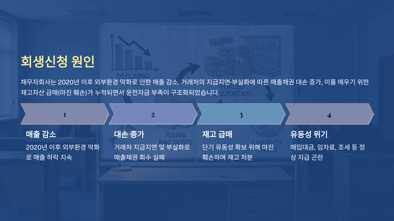 채무자회사는 2020년 이후 외부환경 악화로 인한 매출 감소, 거래처의 지급지연·부실화에 따른 매출채권 대손 증가, 이를 메우기 위한 재고자산 급매(마진 훼손)가 누적되면서 운전자금 부족이 구조화되었다.