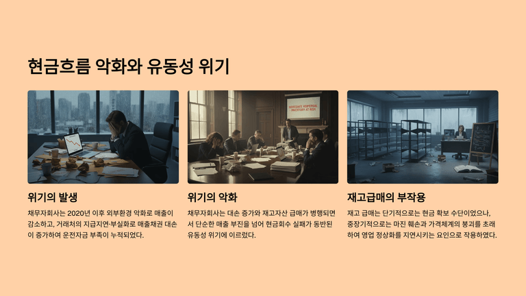 채무자회사는 매출채권 대손 증가와 재고 급매가 동시에 발생함으로써 단순한 매출 부진을 넘어 현금회수 실패가 동반된 유동성 위기를 겪었다. 재고 급매는 단기 처방으로는 유효하였으나 중장기적으로는 마진 훼손과 가격체계의 붕괴를 초래하여 정상화 시점을 지연시키는 요인으로 작용하였다.