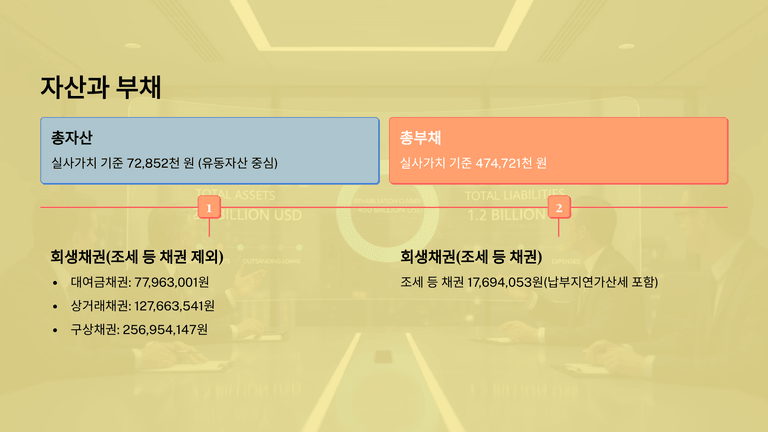 채무자회사는 실사가치 기준 총자산 72,852천 원으로 자산의 대부분이 유동자산(당좌자산 및 재고자산 중심)으로 구성된다. 채무자회사는 실사가치 기준 총부채 474,721천 원으로 부채초과 상태이다.