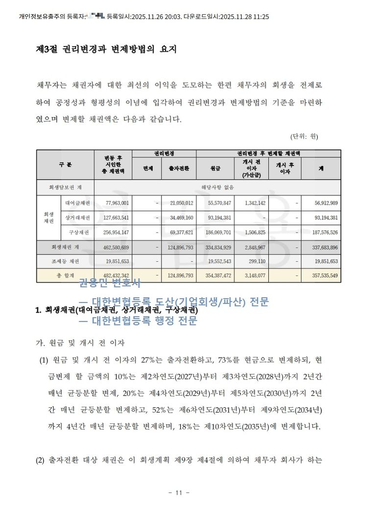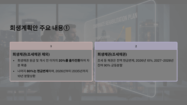 회생채권에 대하여 원금 및 개시 전 이자의 20%를 출자전환하고, 나머지 80%는 현금변제하며, 현금변제는 2026년부터 2035년까지 10년 분할상환한다.