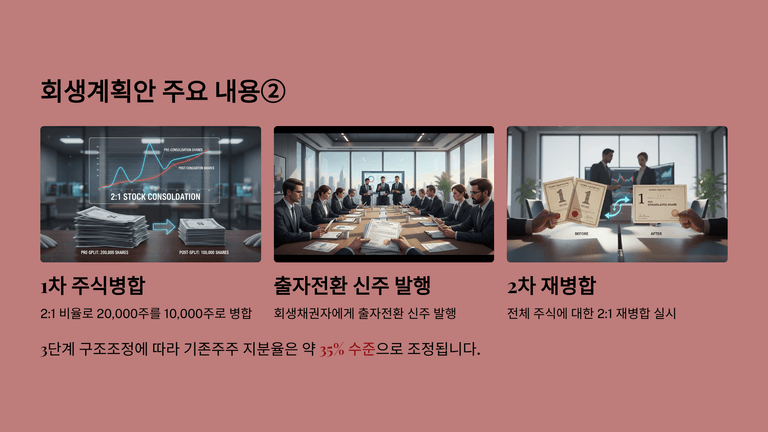 주주 권리조정으로 2:1의 1차 주식병합(20,000주를 10,000주로 병합), 출자전환 신주 발행, 전체 주식에 대한 2:1 재병합의 3단계 구조에 따라 최종적으로 기존주주 지분율은 약 35% 수준으로 조정된다.