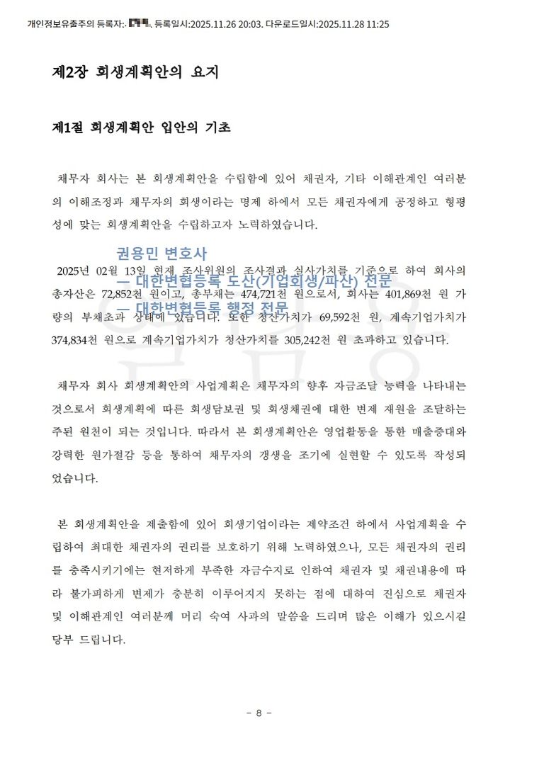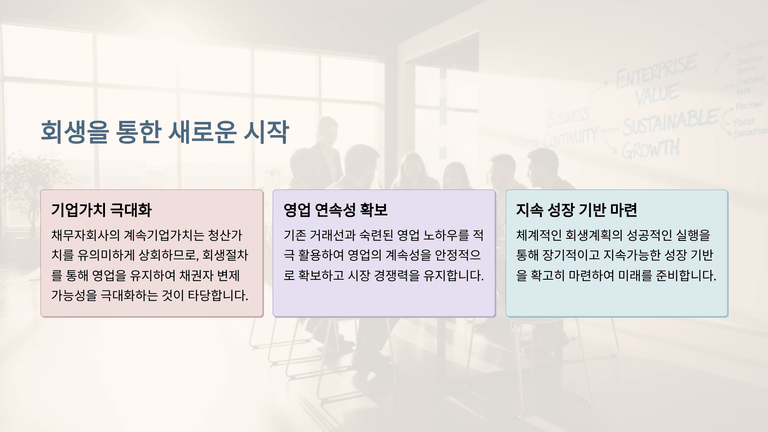 또한 채무자회사는 2025년 2월 기준 조사에서 계속기업가치가 청산가치를 유의미하게 상회하는 것으로 평가된 점에 비추어, 청산에 의한 처분보다 회생절차를 통하여 영업을 유지하면서 채권자 변제 가능성을 극대화하는 것이 타당하다.