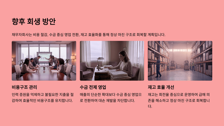 채무자회사는 향후 회생방안으로 인력 증원을 억제하고 불필요한 지출을 절감하여 비용구조를 관리하며, 매출의 단순한 확대보다 수금 중심 영업으로 전환하여 대손 재발을 차단하고, 재고는 회전율 중심으로 운영하여 급매 의존을 해소하여 최종적으로 정상 마진 구조로 회복할 계획이다.