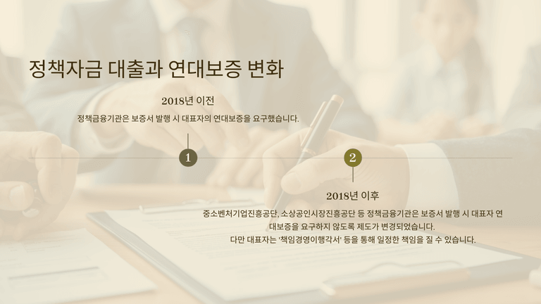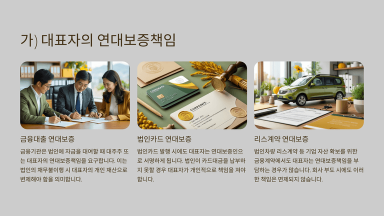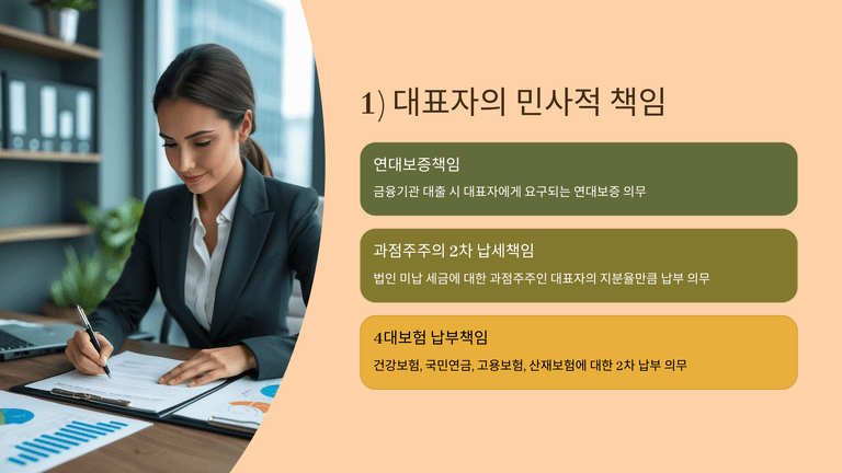 민사책임의 핵심은 ①대표자(또는 대주주) 연대보증과 ②과점주주의 제2차 납세의무, ③과점주주의 4대보험료 제2차 납부의무이다. 정책자금 보증은 2018년 이후 정책금융기관 보증서 발급 시 대표자 연대보증 요구가 폐지되었으나, 일반자금 대출·법인카드·리스 등에서는 여전히 연대보증이 빈번하다.