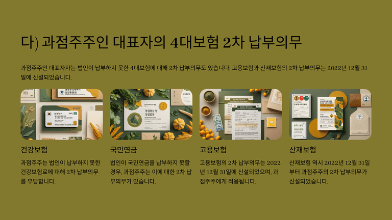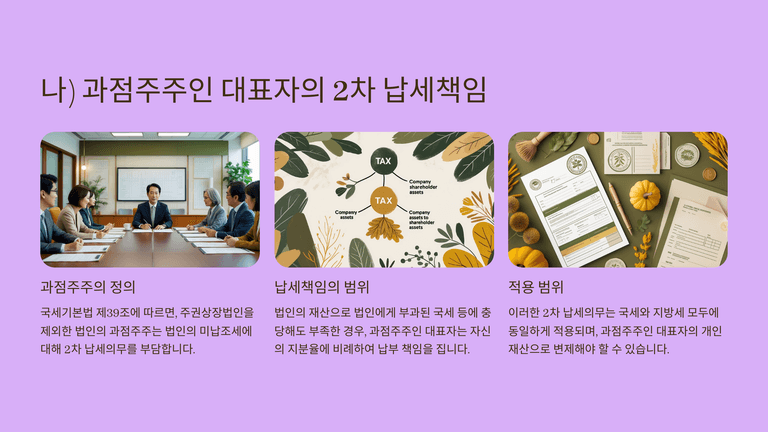 또한 법인재산으로 국세·지방세를 충당해도 부족하면 납세의무 성립일 현재 과점주주(특수관계인 포함 지분 50% 초과 및 지배적 영향력 행사자)가 지분비율 범위에서 제2차 납세의무를 부담한다. 같은 구조로 과점주주는 건강보험·국민연금뿐 아니라 고용보험·산재보험까지 일정 요건하에 제2차 납부의무를 부담할 수 있어, 대표자가 과점주주 지위를 겸하면 개인 부담으로 전이된다.