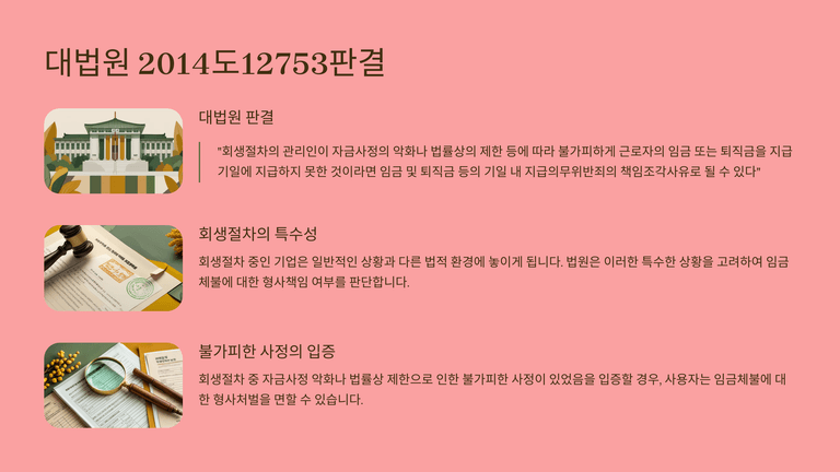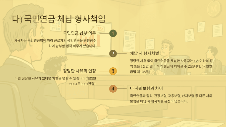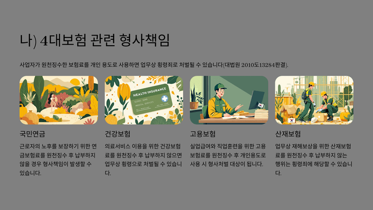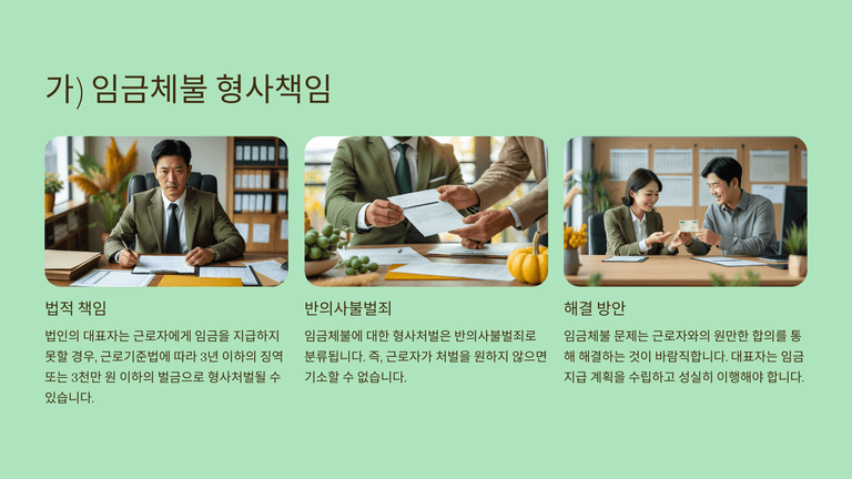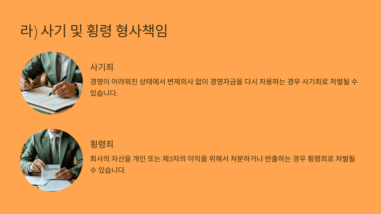 형사책임으로는 임금·퇴직금 체불에 따른 근로기준법 위반(반의사불벌), 4대보험료 원천징수 후 전용 시 업무상 횡령, 국민연금 정당한 사유 없는 체납 처벌, 그리고 경영악화 상태에서 무변제 의사로 차용하면 사기, 회사자산을 사적·제3자 이익을 위해 처분·반출하면 횡령 등이 문제될 수 있다. 결국 회생절차와 병행하여 대표자 개인의 보증·조세·보험·노동 및 형사 리스크를 별도로 정리하는 전략이 필요하다.