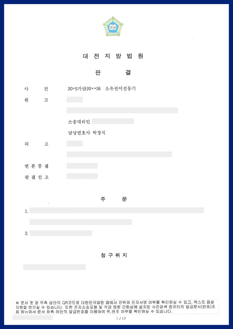 재판부는 피고 명의로 이전된 이 사건 소유권이전등기는 원인무효 등기로서 말소되어야 하고, 진정등기명의의 회복을 원인으로 한 소유권이전등기절차를 이행할 의무가 있다고 판단하였습니다.