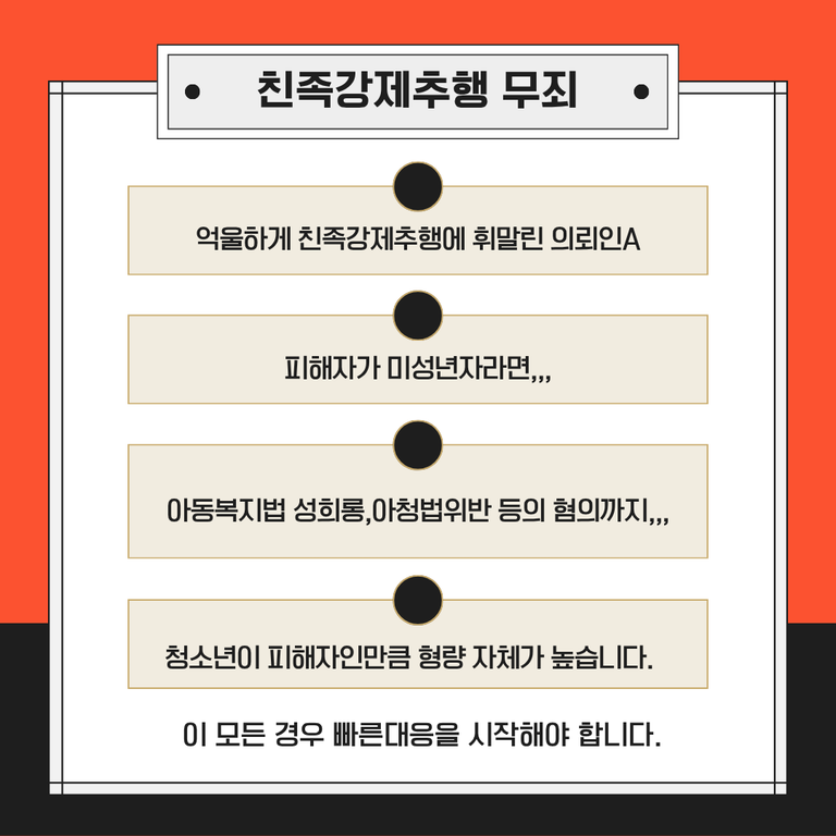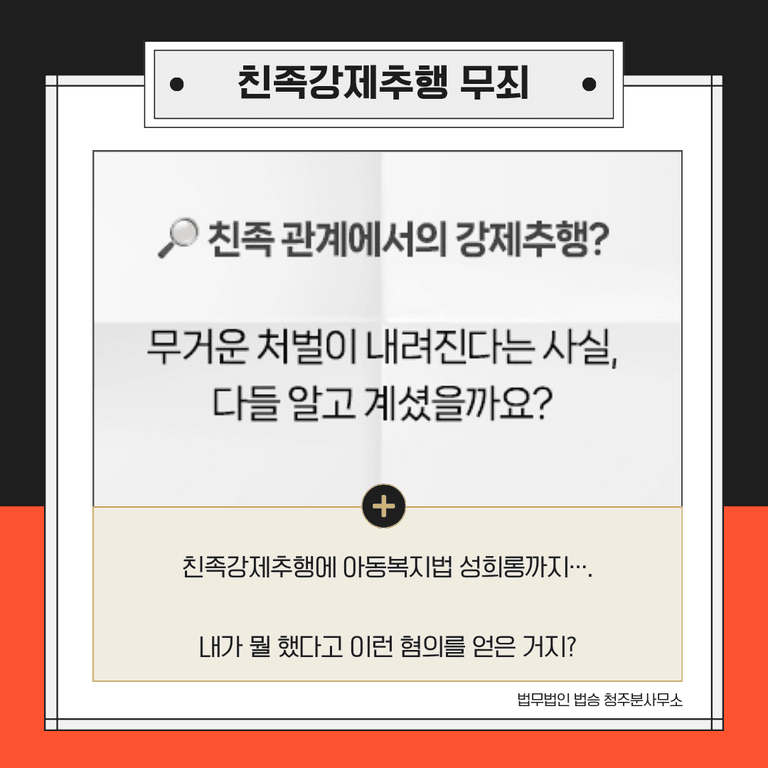 그러니 혹시라도 친족강제추행 사안에 억울하게 휘말렸다면변호사의 조력을 받아 문제를 해소해 보아야 합니다. 특히 조카가 ‘미성년자’일 시, 여러분께서는 아동복지법 성희롱, 아청법 위반 등의 혐의도 함께 얻을 수 있으니 주의가 필요합니다.