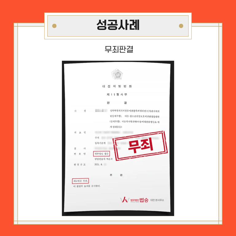 [법무법인 법승]은 이러한 자백에 힘입어, B가 어쩌다가 거짓말을 고하게 되었는지 소명하는 변론 요지서를 제출해 보았는데요. 다행히도법원에서는 ‘전부 범죄의 증명이 없는 때에 해당된다’며 무죄 판결을 내리게 되었습니다. 갑작스레 피의자로 지목된 후 결국 재판까지 회부되며 심신이 많이 지쳐 있던 A는 드디어 무고함을 증명하게 되었다며 기뻐하셨는데요. 성범죄의 특성상 B의 주장만으로도 친족강제추행죄가 인정될 수 있는 상황이었으나, 아동복지법 성희롱까지 모두 무죄 선고를 받는 게 가능했습니다.