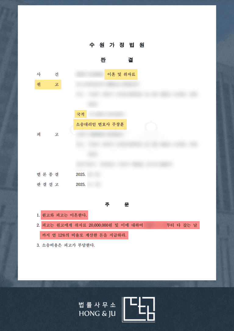 외국인 이혼소송의 원고를 조력하게 된 주창훈 안산이혼전문변호사는 의뢰인이 외국인으로서 겪는 막막함에 공감하며 혼인 파탄의 귀책 사유가 전적으로 피고(남편)에게 있음을 입증하는 데 주력했습니다.